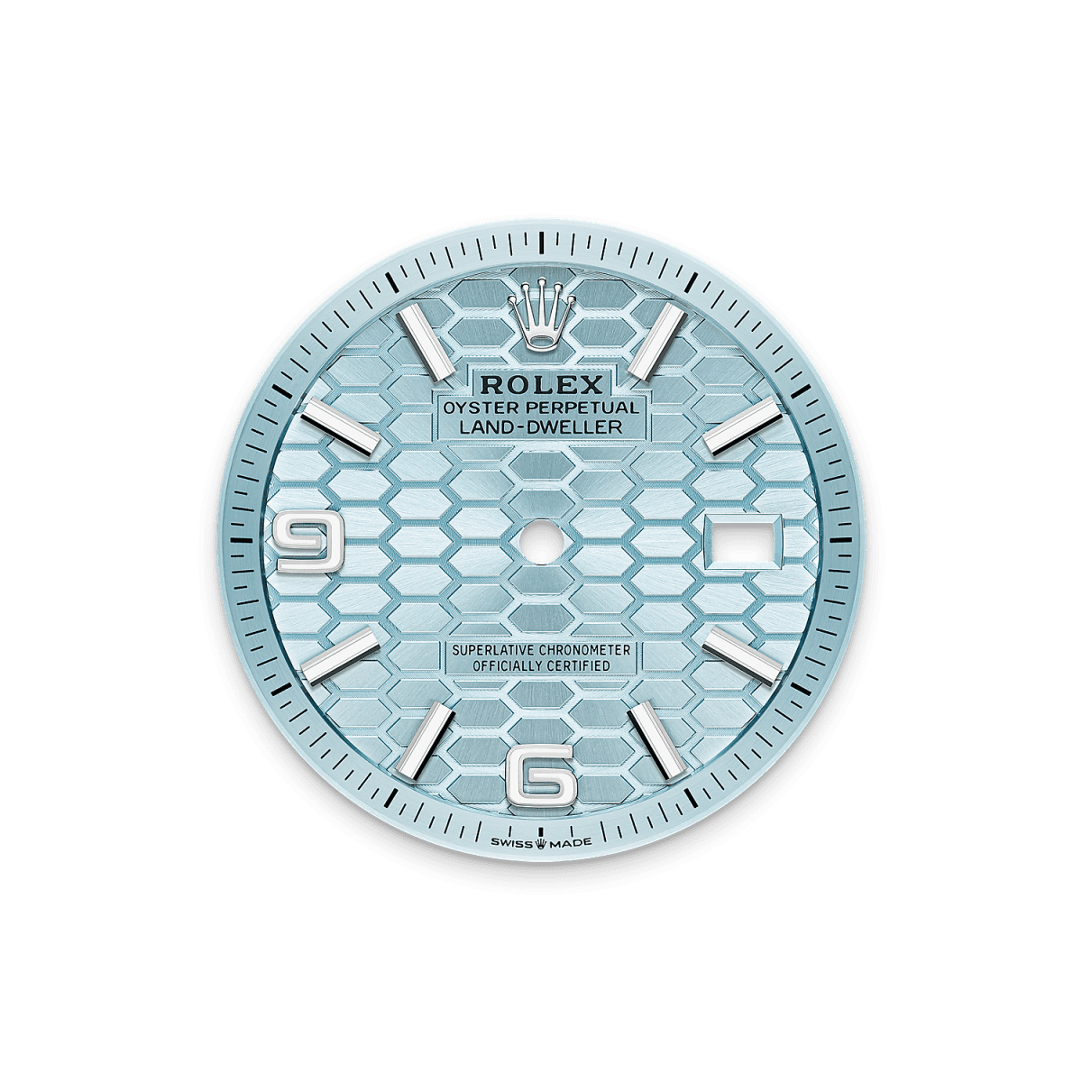 ساعة لاند دويلَر ٤٠ من البلاتين المجهّزة بمينا أزرق فاهٍ، زخرفة أقراص العسل وسوار جوبيلي مسطّح.