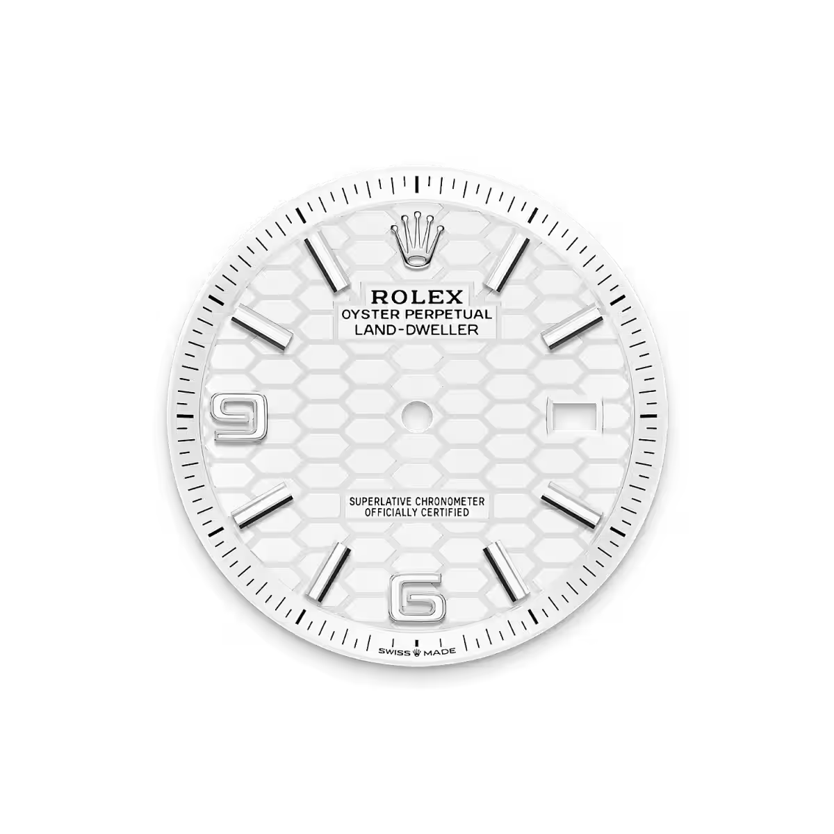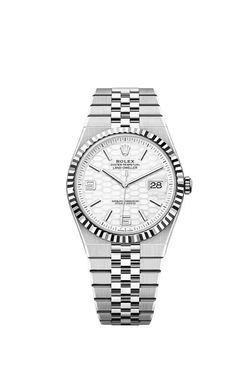 ساعة لاند دويلَر ٤٠ من فولاذ أويستر ستيل والذهب الأبيض المجهّزة بمينا أبيض ناصع، زخرفة أقراص العسل وسوار جوبيلي مسطّح.