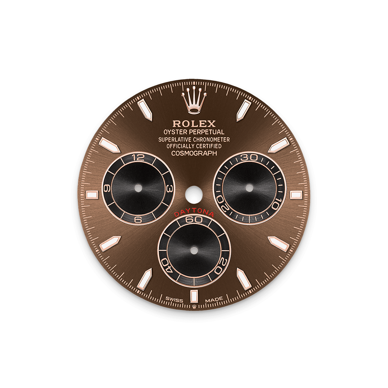 جُهّز إصدار أويستر بربتشوال كوزموغراف دايتونا المصنوع من ذهب إيفروز عيار ١٨ قيراطًا بمينا بني داكن وأسود وبسوار أويسترفلكس وبإطار سيراكروم أسود مزوّد بمقياس تاكيمتري.