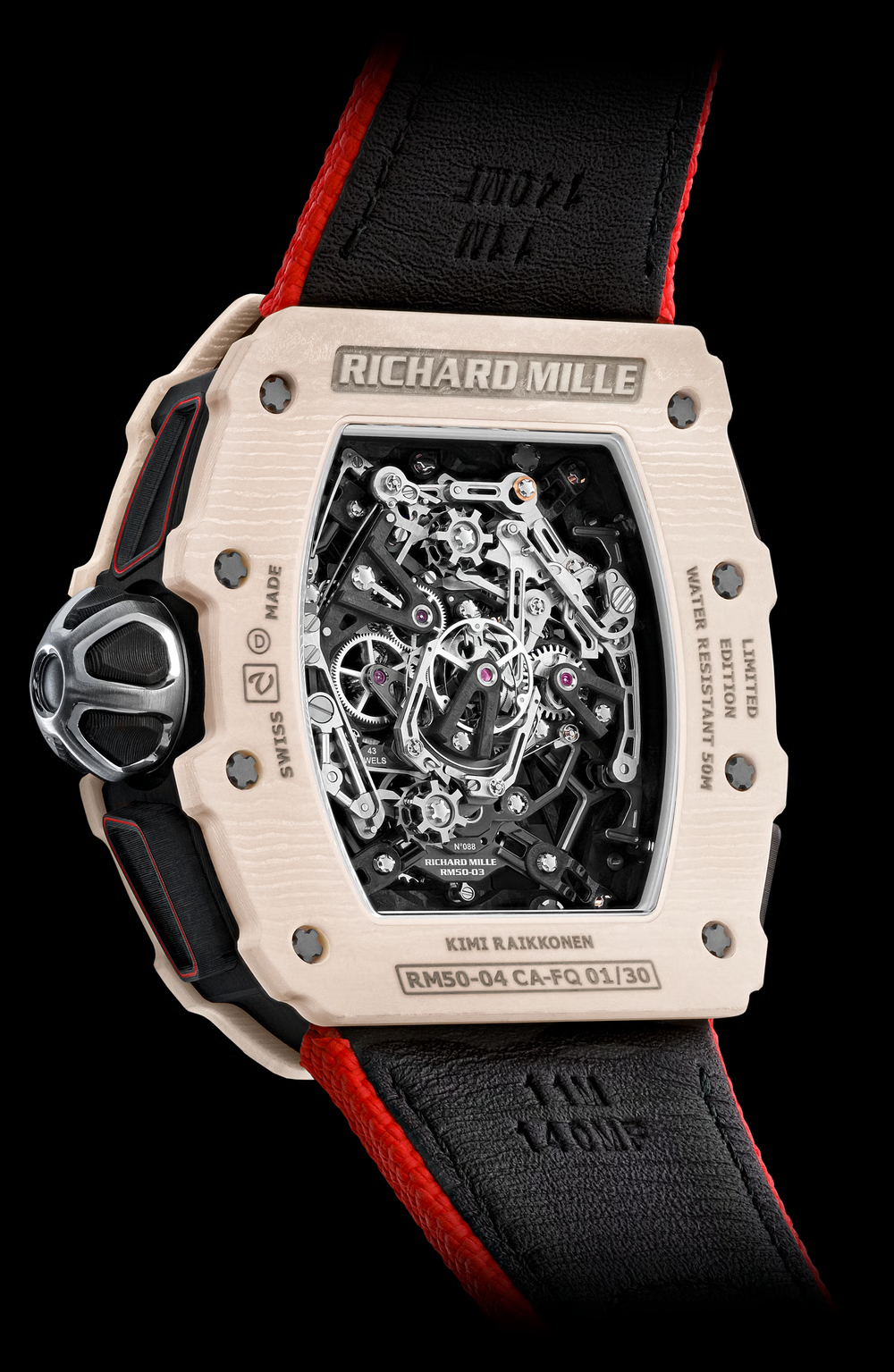 ا تمثّل ساعة RM 050 مجرد مراجعة بسيطة لنظام الحركة الحالي لطراز RM 008. بدأ مهندسو ريتشارد ميل بالبحث عن كل الطرق الممكنة لخفض وزن الحركة بنسبة 20٪، أي ما يعادل 10 غرامات، ما يجعل الوزن الكلي للحركة 9.5 غرامات فقط.