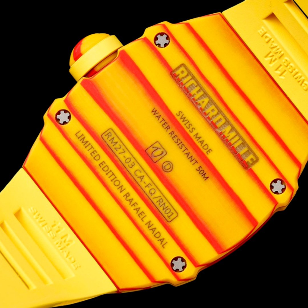 تجمع الساعة بين الأحمر والأصفر، لوني علم إسبانيا وطن نادال، مع تدرجات تلمح إلى ملاعب الطين الأحمر في بطولة رولان غاروس المفتوحة.