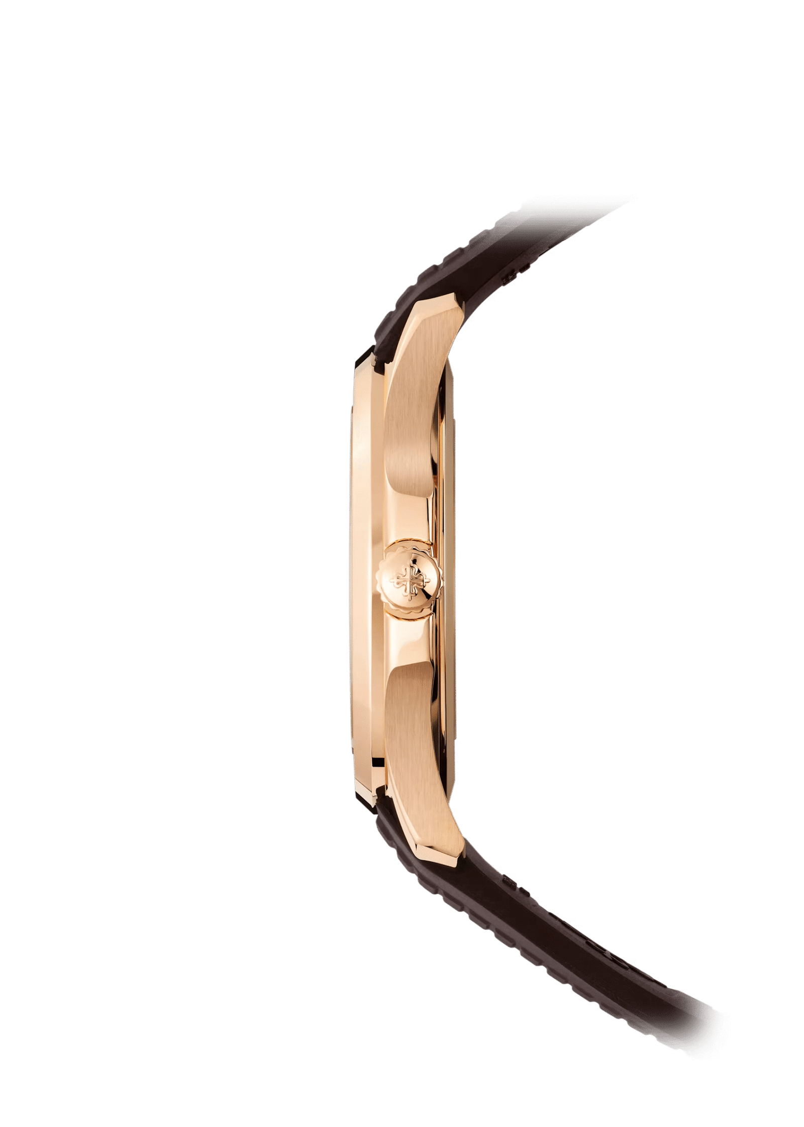 بني مشع بحافة متدرجة سوداء، نقش Aquanaut بارز، أرقام من الذهب الوردي مع طلاء متوهج أبيض. عقارب عصوية من الذهب الوردي مع طلاء متوهج أبيض.