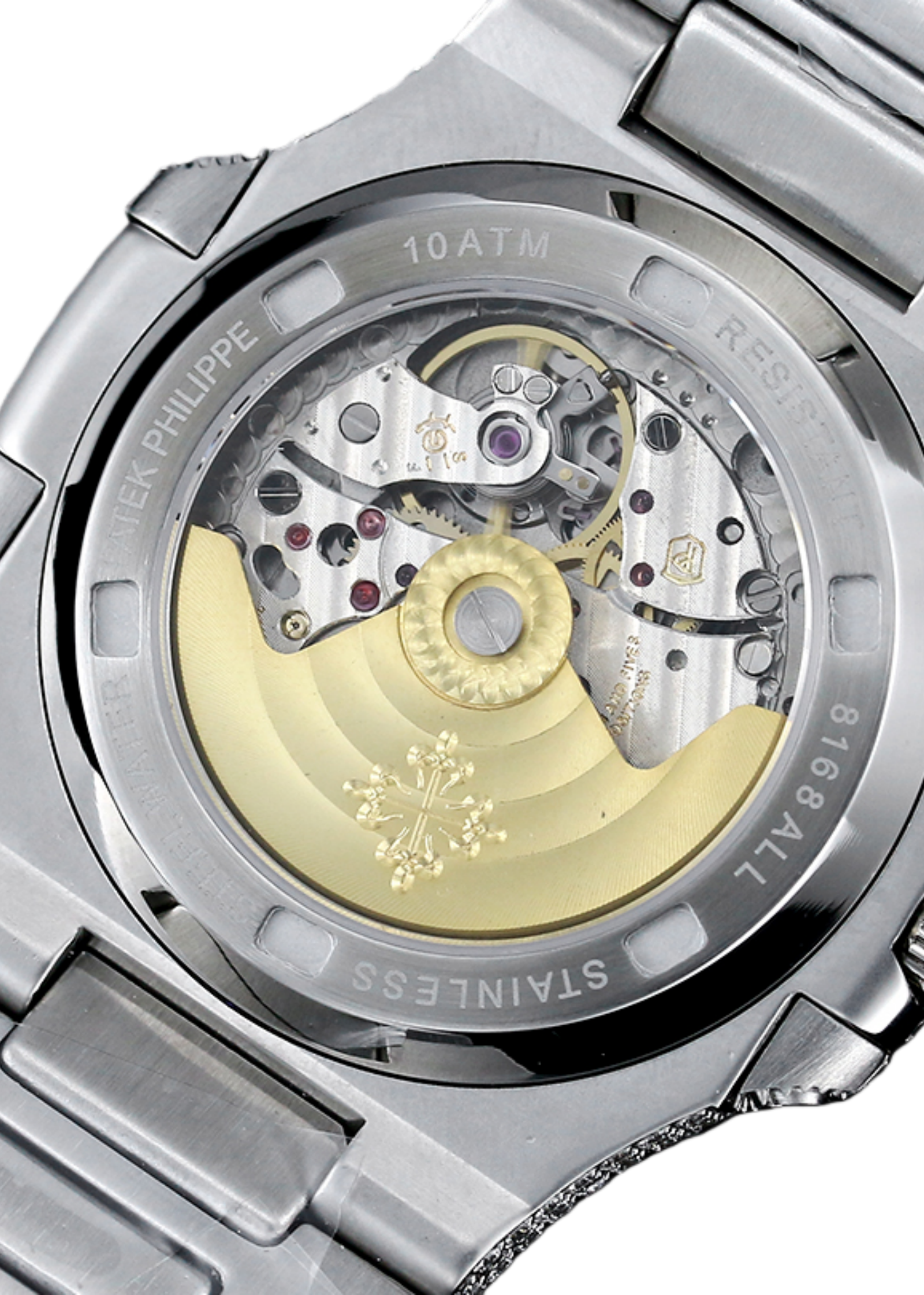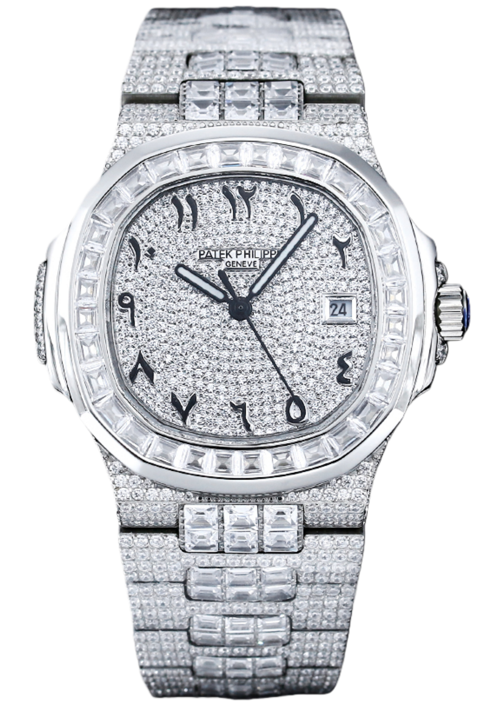 ساعة نوتيلوس 5711 من الذهب الأبيض. تحتوي النسخة الجديدة المطورة على صف مزدوج من خواتم الماس الكبيرة، وهو مزيج مثالي من المجوهرات غير العادية المشهورة عالميًا للعلامة التجارية وأنفاس الطفل. تتميز هذه الساعة الفاخرة بتصميم فريد وساحر. إنه تسامي للحرفية المثالية ورمز لمكانة الأشخاص الناجحين. حركة ميكانيكية أوتوماتيكية أصلية مستوردة من Cal.8215 معدلة 324 من الخشب الرقائقي، قطر 40 × 11.5 ملم، ساعة فاخرة للغاية، ذهب متلألئ، تكنولوجيا مرصعة بالماس، ألماس سواروفسكي من الذهب الأبيض عيار 18 قيراط. عسل فائق ومليء بالألماس، مرآة كريستال الياقوت على الوجهين، عرض التقويم، مقاومة للماء بعمق 50 مترًا.