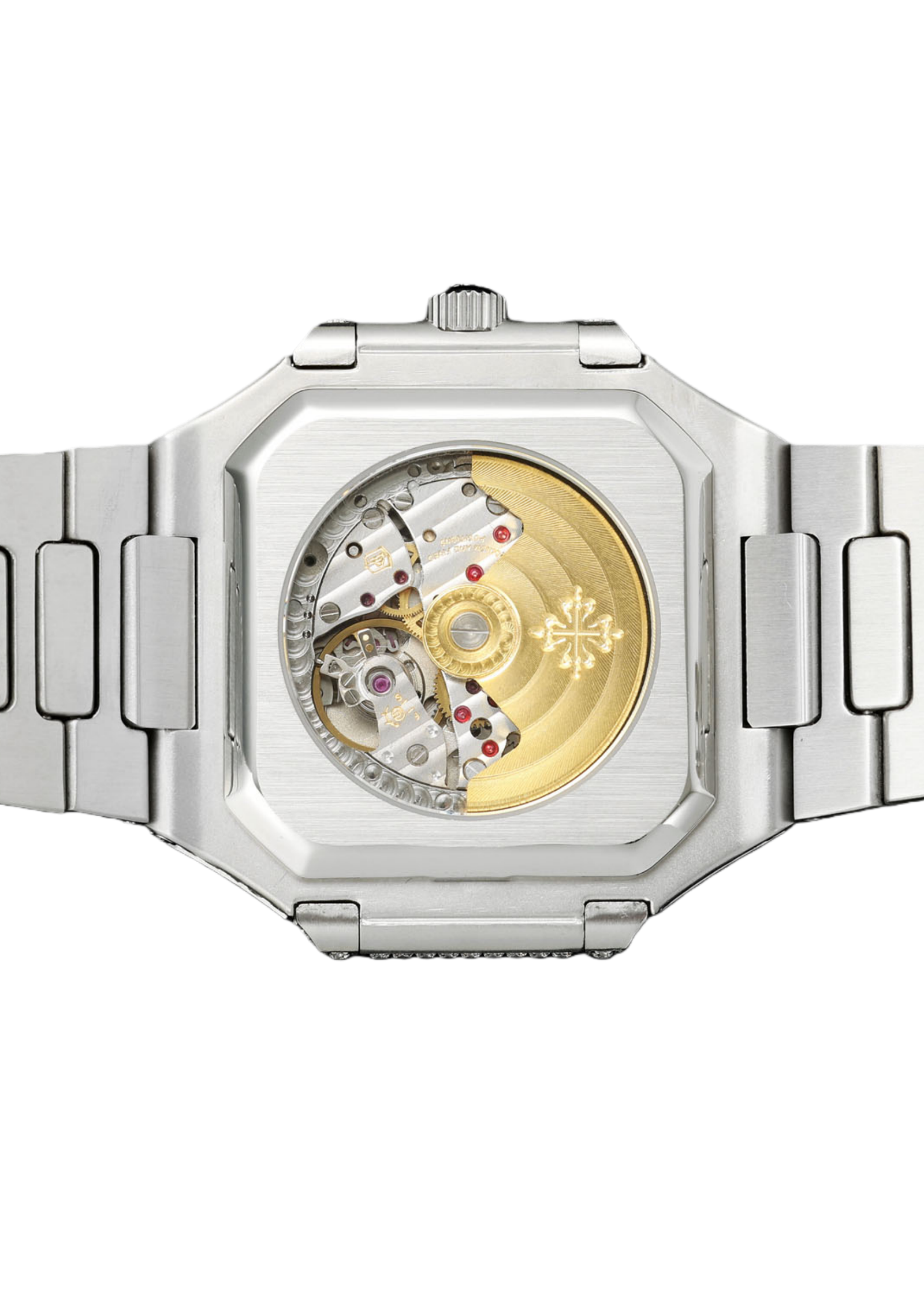 المزيج المثالي من الفولاذ المقاوم للصدأ والألماس في سلسلة Patek Philippe CUBITUS 58211A-001 يجمع بذكاء بين الفخامة والرياضة. تم ترصيع قطع الماس الرائعة على العلبة، مما يعكس ضوءًا جميلاً. سطح المرآة مصنوع من زجاج كريستال الياقوت المقاوم للخدش والصدمات. توجد نافذة تقويم عند الساعة 3، بتصميم كلاسيكي ثلاثي الدبابيس، والذي لن يبدو معقدًا وزائدًا عن الحاجة. يتميز كل من المظهر والأداء بالدقة، ويتم التحكم في سمك رأس الساعة بشكل مثالي. تمت ترقية المجوهرات غير العادية المشهورة عالميًا للعلامة التجارية والتي تمت ترقيتها حديثًا بشكل مثالي مع النجوم. تتميز ساعة Patek Philippe الفاخرة هذه بتصميم فريد وساحر. إنه تسامي للحرفية المثالية ورمز لمكانة الأشخاص الناجحين.